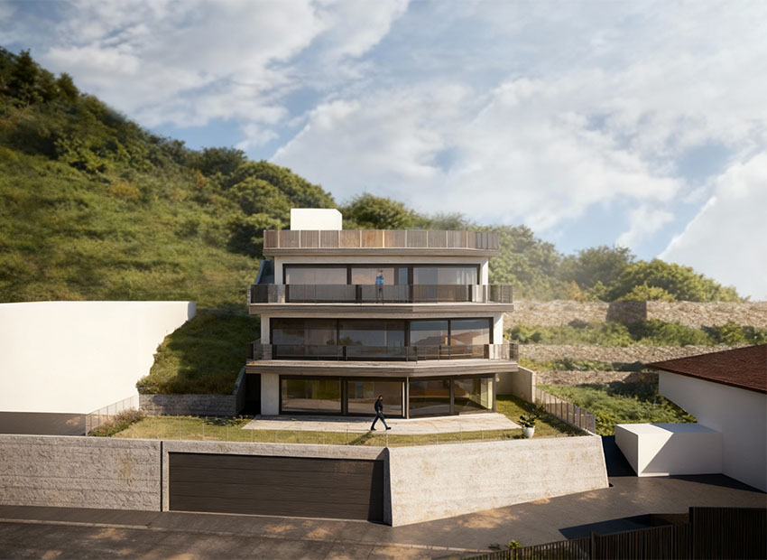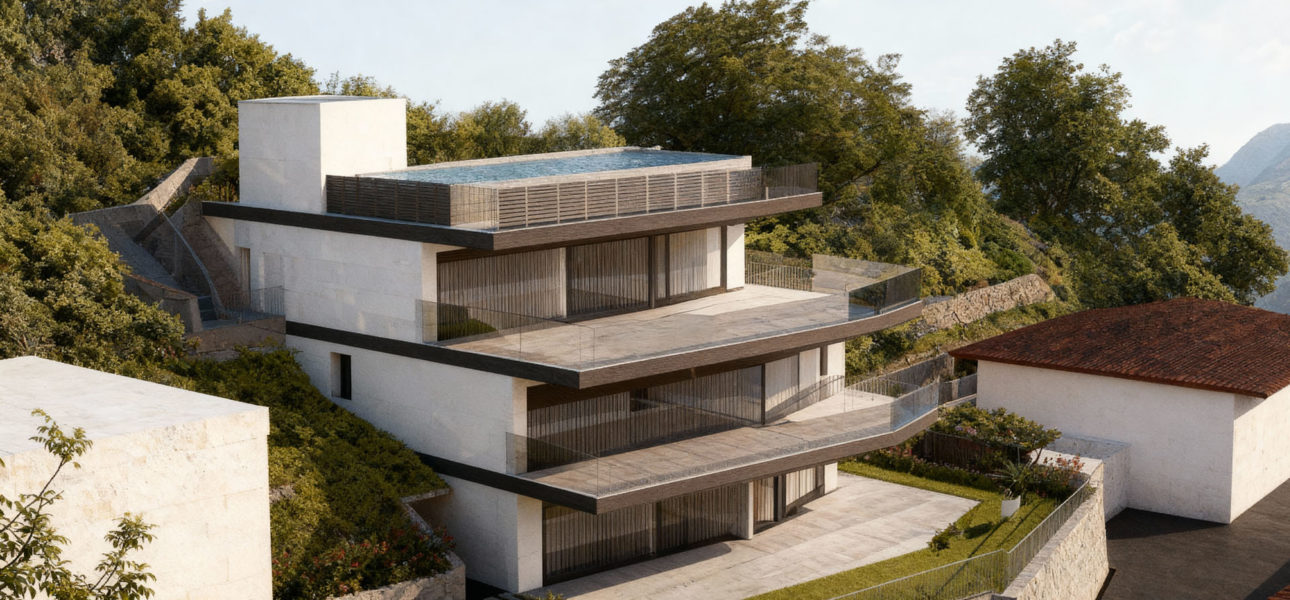 Il piano terra è interamente dedicato alla zona giorno, uno spazio ampio e luminoso che si apre direttamente su un grande giardino privato, creando una continuità fluida tra interni ed esterni. I due piani superiori ospitano la zona notte, concepita per garantire la massima privacy e tranquillità. Il culmine dell’edificio è rappresentato dal tetto, trasformato in un’esclusiva terrazza panoramica dotata di piscina, uno spazio pensato per il relax con una vista dominante sul paesaggio.