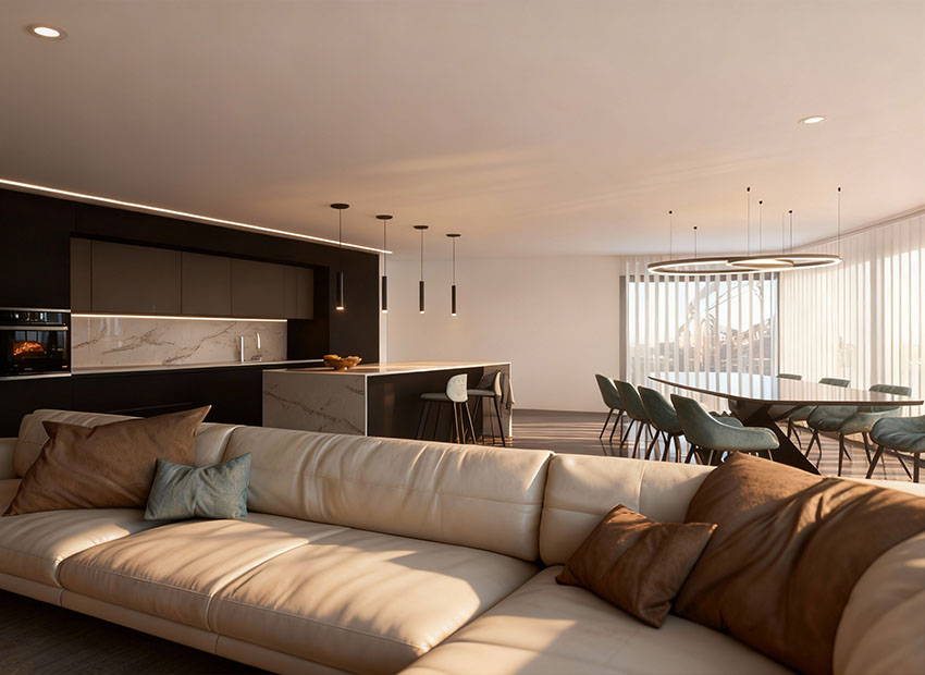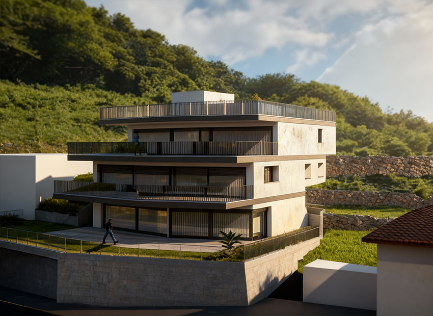 La funzionalità della residenza è completata da un’autorimessa interrata che assicura praticità e sicurezza. Con un volume totale di 7’235 m³, la Residenza 7 Leoni rappresenta un esempio di architettura residenziale che integra design contemporaneo, comfort e un dialogo privilegiato con il contesto naturale.